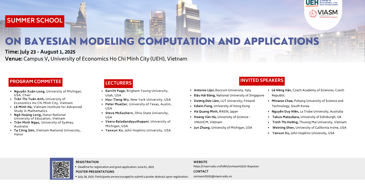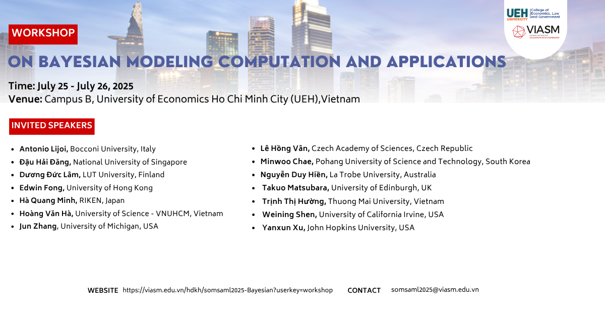 Workshop information: Time: 25 and 26 July 2025 Location: UEH Campus B, 279 Nguyen Tri Phuong Street, Dien Hong Ward, Ho Chi Minh City Invited speakers: Antonio Lijoi, Professor at Bocconi University, Italy antonio.lijoi@unibocconi.it Dr. Dau Hai Dang, National University of Singapore, hddau@outlook.com Dr. Duong Duc Lam, LUT University, Finland, duc-lam.duong@lut.fi Edwin Fong, Assistant Professor, University of Hong Kong, chefong@hku.hk Dr. Ha Quang Minh, RIKEN, Japan, minh.haquang@riken.jp Dr. Hoang Van Ha, University of Science – Vietnam National University, Ho Chi Minh City, hvha@hcmus.edu.vn Jun Zhang, Professor at the University of Michigan, USA, junz@umich.edu Dr. Le Hong Van, Academy of Sciences [...]