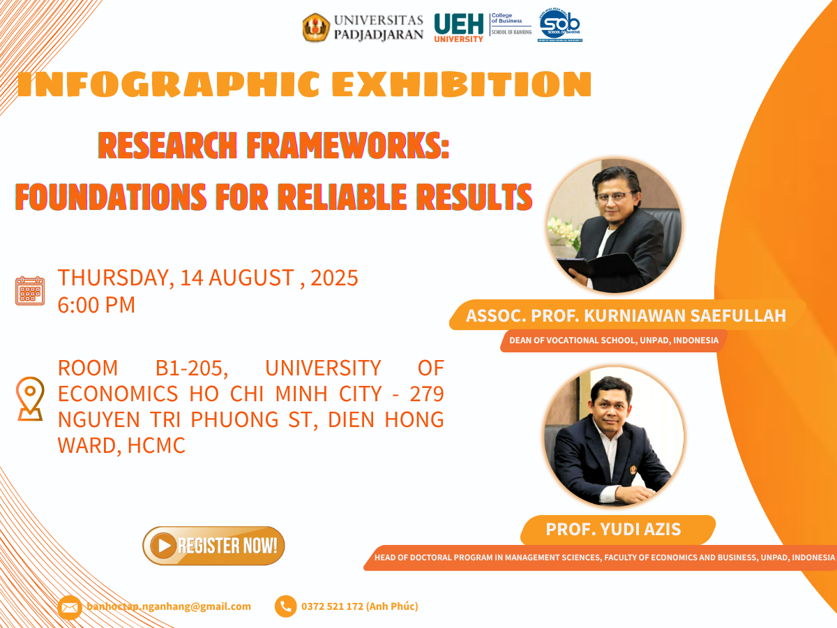 In order to stimulate creative thinking and spread the spirit of scientific research, the Faculty of Banking – UEH Business School respectfully introduces a thematic sharing session with the participation of speakers who are experts, professors and experienced lecturers. Within the framework of the program, the speakers will directly share about the methods and ways of conducting scientific research, and at the same time share practical experiences, how to turn complex concepts into clear, engaging and vivid scientific stories. The sharing session is combined with an Infographic exhibition, where students have the opportunity to apply the knowledge they have just [...]